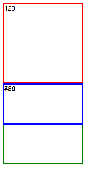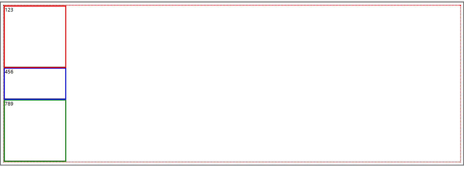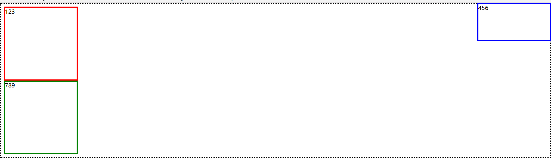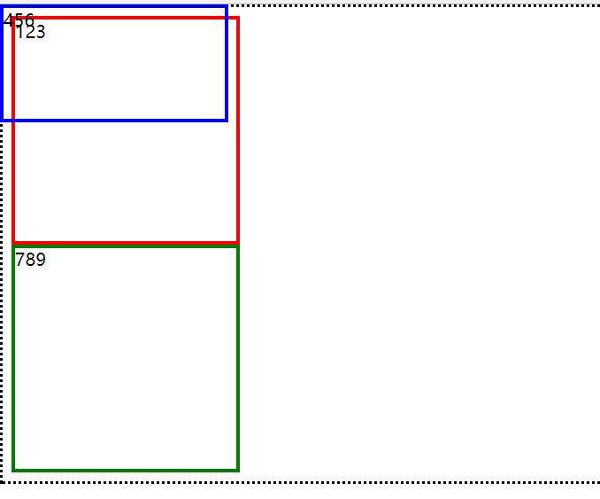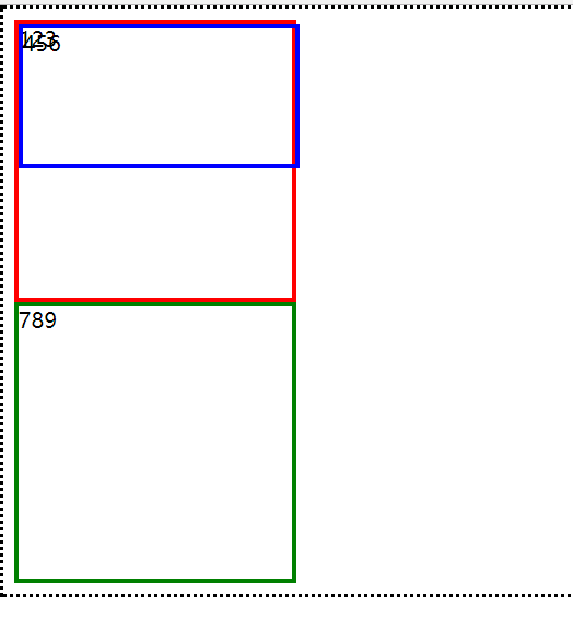 | <!DOCTYPE html> <html lang="en"> <head>     <meta charset="UTF-8">     <title>Title</title>     <style>         .first {             width: 200px;             height: 200px;             border: 3px solid red;         }         .second {             width: 200px;             height: 100px;             border: 3px solid blue;             position: absolute;             left: 0;             top: 0;         }         .third {             width: 200px;             height: 200px;             border: 3px solid green;         }         html {             border: dotted;         }     </style> </head>   <body>   <div class="first">123</div> <div class="second">456</div> <div class="third">789</div>   </body> </html>