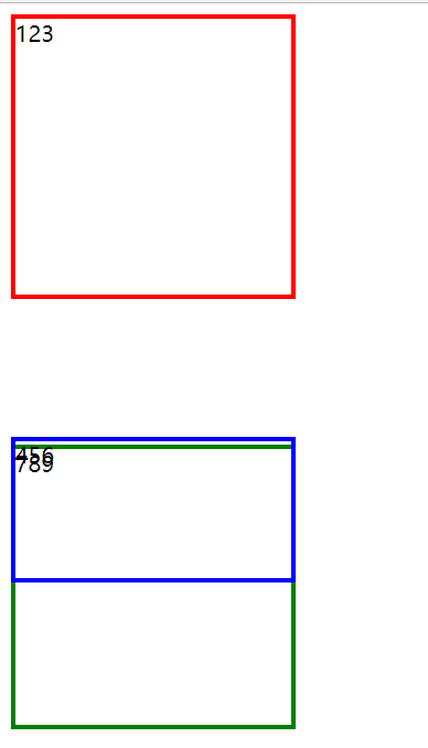 | <!DOCTYPE html> <html lang="en"> <head>     <meta charset="UTF-8">     <title>Title</title>     <style>         .first {             width: 200px;             height: 200px;             border: 3px solid red;             position: relative;         }         .second {             width: 200px;             height: 100px;             border: 3px solid blue;             position: absolute;             left: 0;             top: 0;         }         .third {             width: 200px;             height: 200px;             border: 3px solid green;         }         html {             border: dotted;         }     </style> </head>   <body>   <div class="first">     123     <div class="second">         456     </div> </div> <div class="third">     789 </div>   </body> </html>