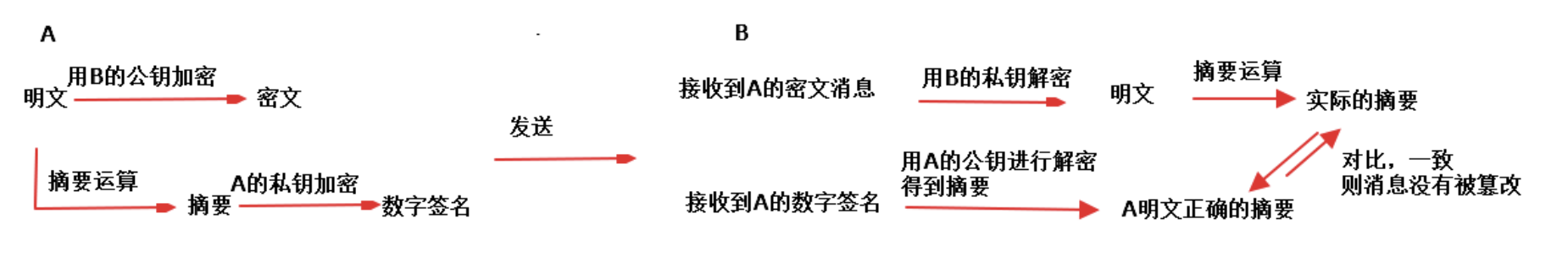 A:将明文进行摘要运算后得到摘要(消息完整性),再将摘要用A的私钥加密(身份认证),得到数字签名,将密文和数字签名一块发给B。