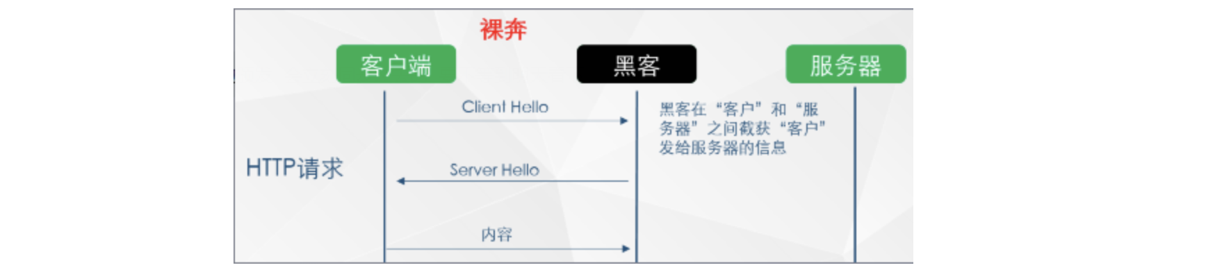 HTTP请求过程中,客户端与服务器之间没有任何身份确认的过程,数据全部明文传输,“裸奔”在互联网上,所以很容易遭到黑客的攻击,如下: