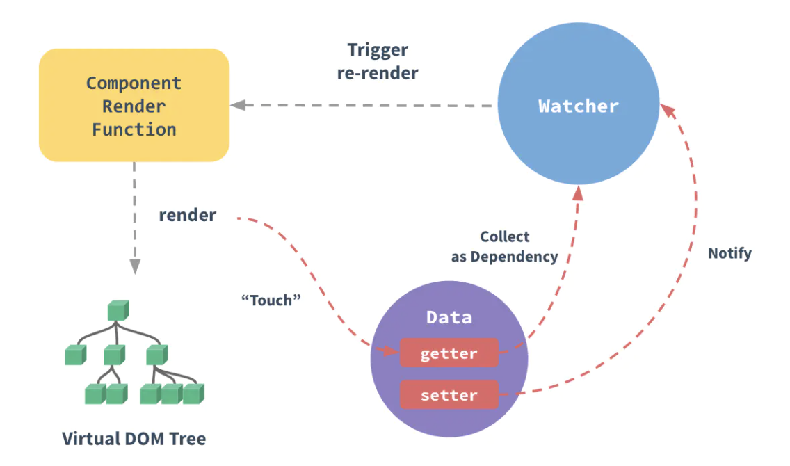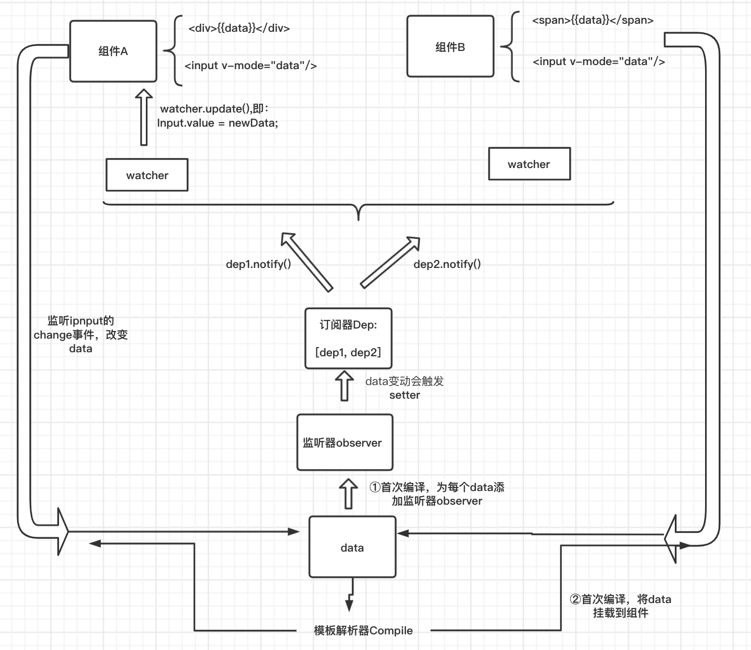 watcher和使用该data的dom相关联,通过this可以访问该dom节点,所以可以通过watcher修改dom的文本属性,如,input组件:this.value = newData, 文本组件this.nodeValue = newData;当订阅器Dep收到data变化,就会通知里面的每一个watch改变dom值