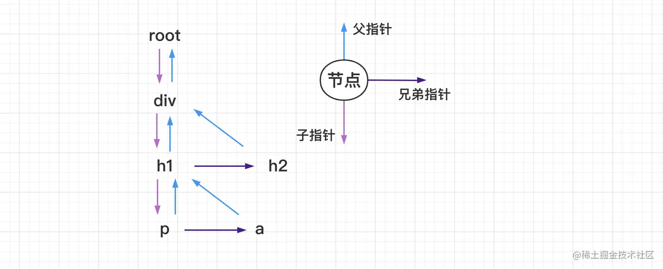 在新的架构中,每个节点有三个指针:分别指向第一个子节点、下一个兄弟节点、父节点。这种数据结构就是 fiber,它的遍历规则如下: