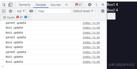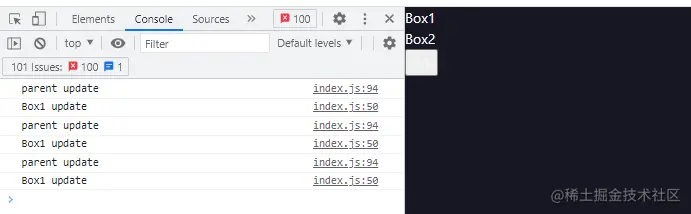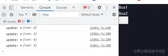 此时,点击 button 按钮的时候,上述 2 个 Box 组件都会进行更新。